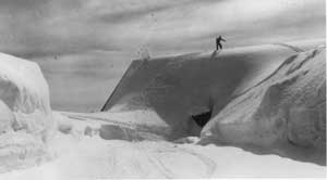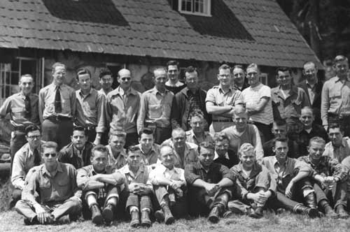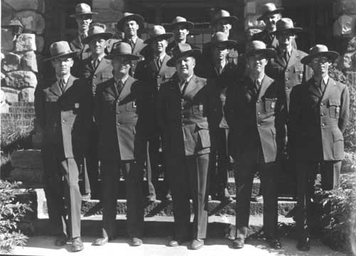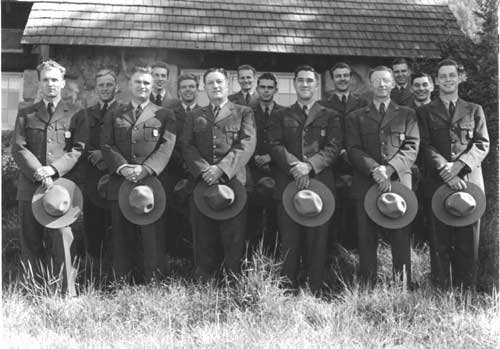 By our last two years at Crater Lake the ranger force had grown to a Chief, Assistant Chief, and two District Rangers. The Assistant Chief and his wife had two school age daughters, and along with two other school age children, were taught by the Assistant Chief's wife, Lucille Sneddon. A large room on the second floor of the Administration Building which at one time had been the Park Commissioner's was set up as a school room. There were also several younger children in the park and Mrs. Sneddon invited them to come for one hour for Kindergarten. The snow would stack up to the windows and at least one time the older girls slid out the windows and down to the parking lot below. The employees got together for square dancing a couple of times a month in the Administration Building during the winter months. The fiscal office and personnel office was one big room and with desks and file cabinets pushed back along the walls, there was room, just barely, for two squares. The Superintendent's office had a nice rug on the floor and babies and small children slept there while the grownups stomped a few feet away. Lou Hallock, the Chief Ranger, had several very good square records which we all enjoyed. The roads were patrolled usually twice a day to watch for errant travelers who could be in trouble on the snow and ice. It was not too unusual to find someone without tire chains with a vehicle stuck on a hill, usually on the west entrance road. Despite warnings that chains might be necessary or required a certain number of people felt they knew better than the Rangers who worked in the snow every day. We helped them, anyway. Several ski clubs from Klamath Falls and Medford set up rope ski tows on slopes usually near the rim and operated under special use permits, to try to take advantage of Crater Lake's copious snowfall and the increasing number of skiers. One of the commercial ventures was setup on the south of the Lodge affording beginner to intermediate ski slopes. Too much snow was the downfall of this operation. The operator and usually one helper would come up on Friday to dig the ropes out of the snow, move the engine up higher and do any other necessary maintenance. Approximately two thirds of the time that winter after all the work was done and the tow was ready to operate for the weekend, it would start to snow, and snow, and snow until the rope and tow were completely buried again. It usually stopped snowing so heavy by 10 a.m. or so on Saturday, but by the time the tow was ready to go again it was nearly time on Sunday to quit. And to add insult to injury it usually snowed very lightly until the next Friday night! As I recall, one season of fighting Crater Lake's snow was enough for that operator. The Rangers maintained a first aid station on the rim. Very few weekends went by that sprains or breaks of the lower extremities weren't taken care of. We had first aid training and refresher training each year before the winter season came on us. Several of the Rangers were qualified instructors. Fortunately, for the Park Visitor, a number of Ranger activities have become highly sophisticated since the 1940's. The care of injured skiers by highly trained E.M.T. Rangers is certainly and example.