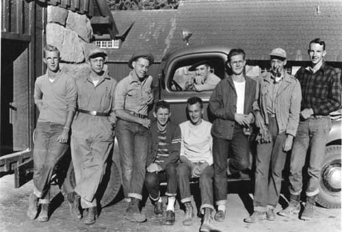 During our entire tour at Crater Lake the Superintendent and the fiscal and personnel office moved to Medford immediately after Labor Day and returned to the park in early June. The Assistant Superintendent was assigned to Klamath Falls for public relations during the winter. The mechanics, plow operators, warehouse personnel and the ranger force remained in the park. We were often greeted in nearly disbelief by relatives and friends in Roseburg, or even in Klamath Falls or Medford, when they learned we lived and worked all year at Crater Lake. "Aren't you snowed in?" was the usual comment. And "What do you do in all that snow?" The truth is we were snowed in only one time in the four winters we were there and that was because the highways outside the park were snowed shut. Our plow operators had to go outside the park to help the State out. I don't think our operators could be beaten by anyone any place for efficient snow removal. We obtained our groceries, visited doctors, dentists, etc.... in Klamath Falls and seldom went to Medford as it was a little further and most every adult at Crater Lake was quite adept at putting on tire chains. Several of us formed a ski club and bought a ski tow, rope with engine, and during our tour had it on several different hills close to Headquarters. This was the first exposure to skiing that several of us had and we got to be at least intermediate skiers. The ranger force and the electrician and helpers got quite a bit of practice in cross country skiing. Power lines went down with regularity when wet snow caused them to break and manpower had to pull them out of the snow to be repaired. We did have a Tucker Snow-Cat, manufactured in Medford. This was an experimental model which had skis and wheels on the front and tracks on the back. Later models had tracks front and rear, which worked better in the conditions at Crater Lake. It did tend to throw the tracks in heavy snow. It also slid into the holes next to trees. Many trips included a lot of time digging out the Snow-Cat. Some folks can't stand long winters with copious amounts of snow, but during our tour at Crater Lake the employees and families were apparently very well adjusted. Several families were kept quite busy raising very small to school age children.
